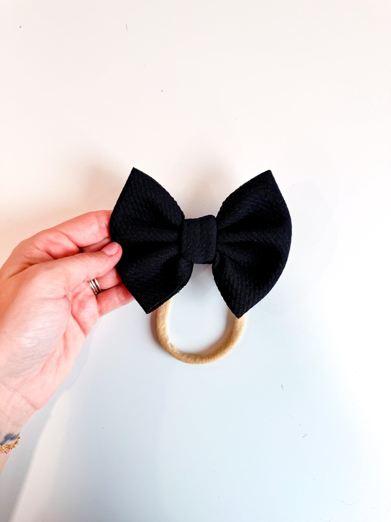 This Classic Black Fancy Bullet Bow is the ultimate accessory for your little nestling. Crafted from durable bullet fabric, the Fancy bullet bow headwrap is designed to maintain its shape without sagging. Perfect for bringing home baby outfit, all the way to summer adventures!