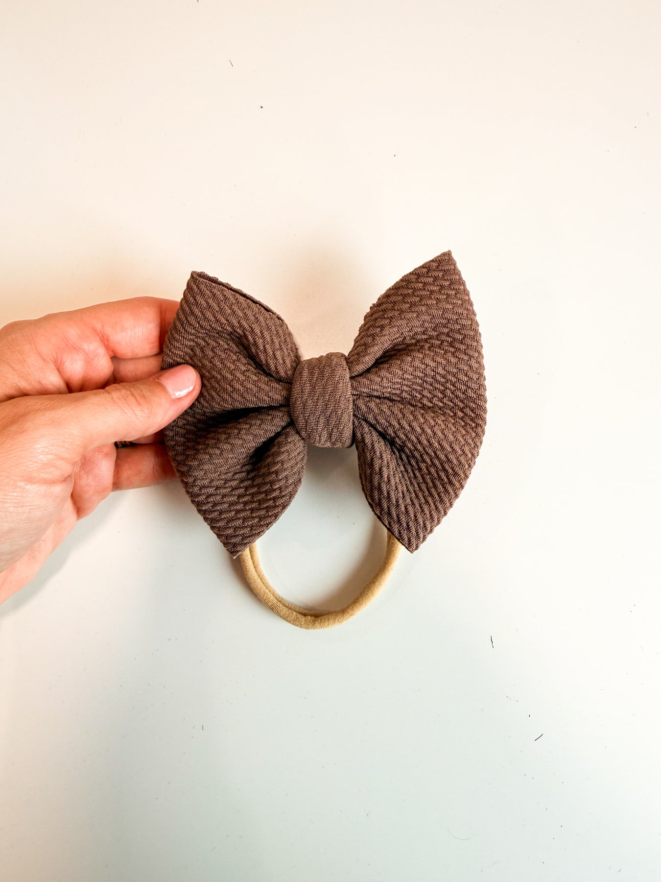 This chocolate brown Fancy Bullet Bow is the ultimate accessory for your little nestling. Crafted from durable bullet fabric, the Fancy bullet bow headwrap is designed to maintain its shape without sagging. Perfect for bringing home baby outfit, all the way to summer adventures!