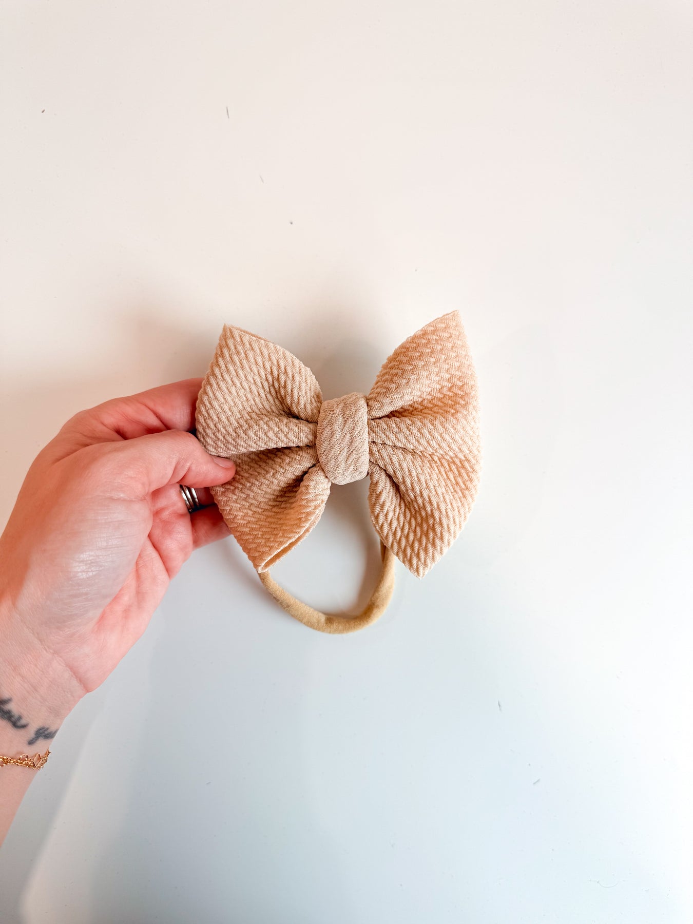 This Tan Fancy Bullet Bow is the ultimate accessory for your little nestling. Crafted from durable bullet fabric, the Fancy bullet bow headwrap is designed to maintain its shape without sagging. Perfect for bringing home baby outfit, all the way to summer adventures!