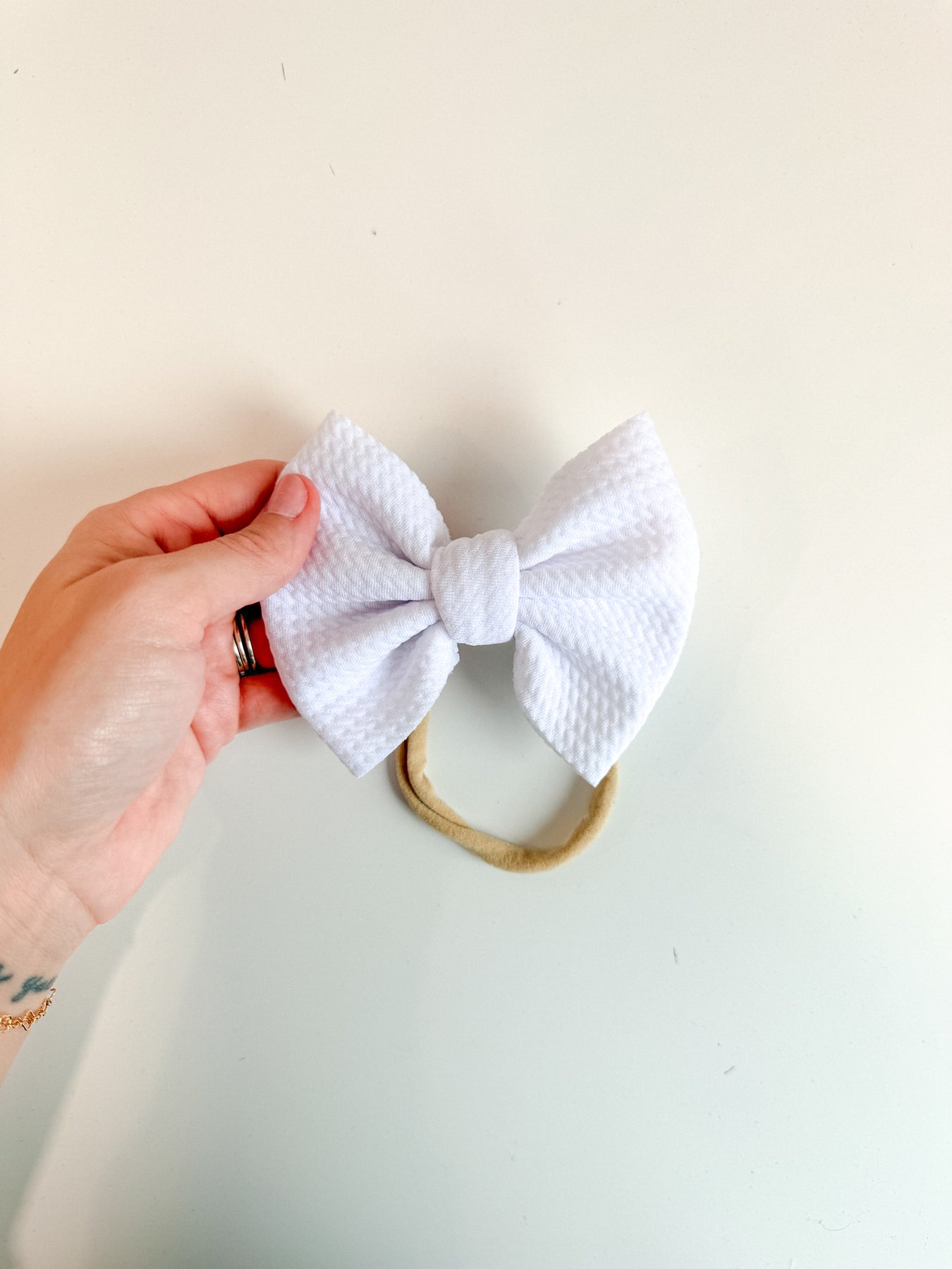 This White Fancy Bullet Bow is the ultimate accessory for your little nestling. Crafted from durable bullet fabric, the Fancy bullet bow headwrap is designed to maintain its shape without sagging. Perfect for bringing home baby outfit, all the way to summer adventures!