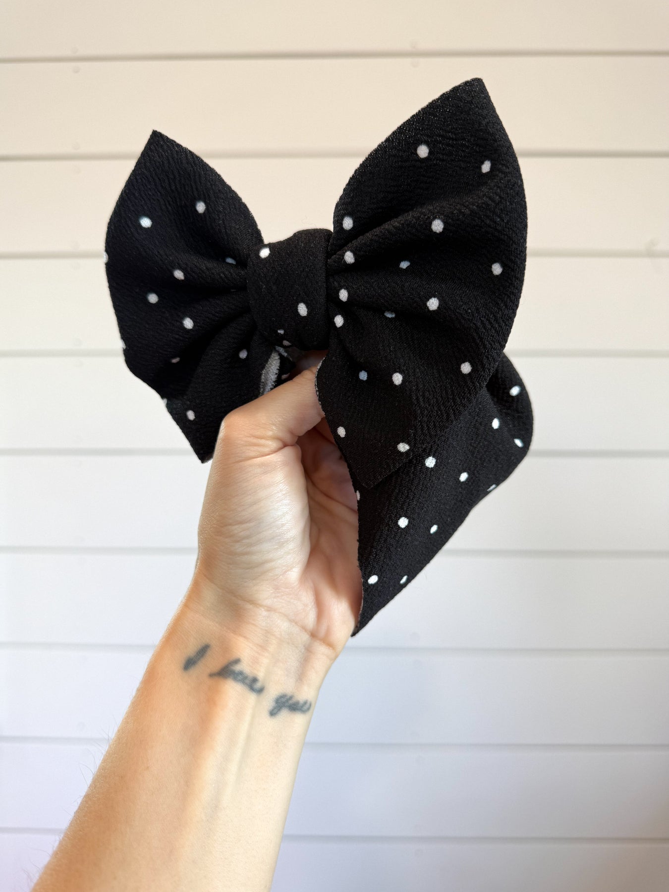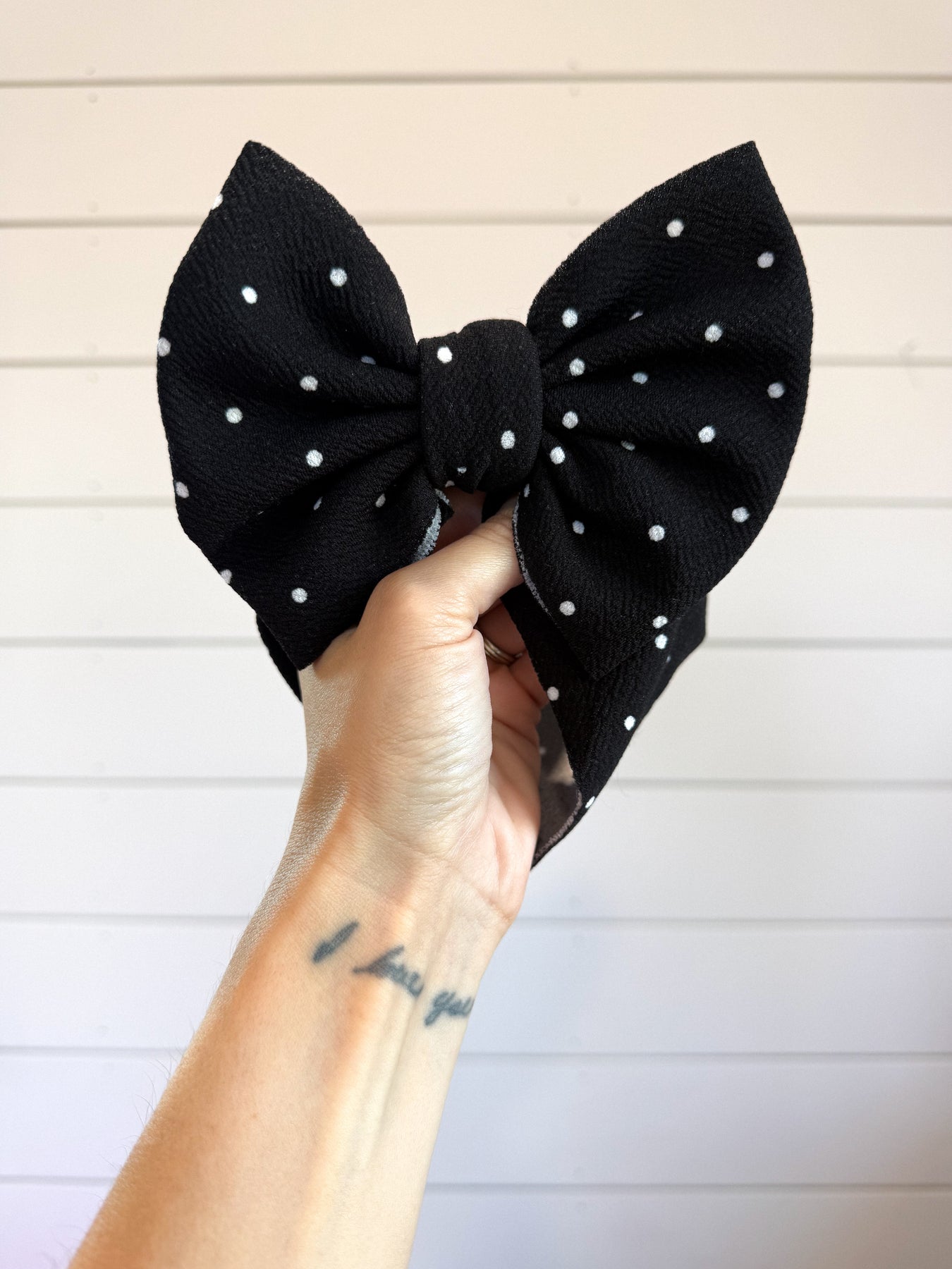 This Black Polka Fancy Bullet Bow is the ultimate accessory for your little nestling. Crafted from durable bullet fabric, the Fancy bullet bow headwrap is designed to maintain its shape without sagging. Perfect for bringing home baby outfit, all the way to daily adventures!